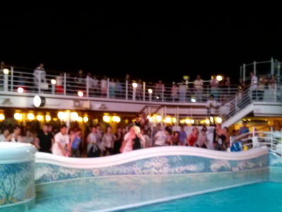 夜遅くまでエンターテインメントがあり、ショー、映画などもしていた。野外の大スクリーンでトムクルーズ主演の映画をしていたので、少し寒かったが最後まで見ました。上映中にも、ウエイターの気配りで、アイスクリームやお菓子を持ってきてくれたりします。もちろん無料ですし、余計なチップの心配もいりません。(チップは、最終精算時に纏めて定額を払う仕組みになっており、チップになれない日本人にとって非常に楽なシステムです。) 今回映画は、合計3本見ました。野外で見た映画以外は、屋内のホールで2本見ましたが結構楽しめました。 その他のエンターテイメントは、マジックショー、ボーカルショーなどもあったが、あまり興味が湧かなかったので少ししか見ていません。